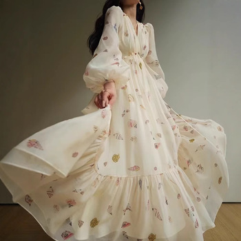 महिलाओं के लिए फ्रेंच शैली पुष्प मैक्सी पोशाक v-गर्दन लालटेन आस्तीन ढीली फिट लंबी गाउन सर्दियों के आकस्मिक सुरुचिपूर्ण चिफं प्राकृतिक