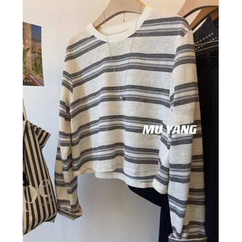 المرأة الكورية نمط مخطط تي شيرت أوائل الخريف فضفاضة طويلة الأكمام رقيقة عارضة أزياء INS تي شيرت لونين